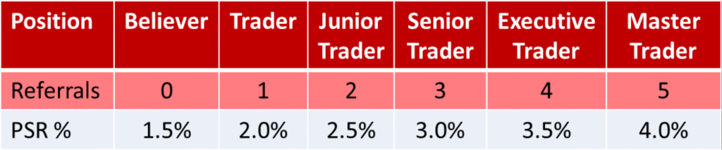 4️⃣ Earn Personal Sales Rewards (PSR) between 1.5% – 4% and Personal Team Reward (PTR) of 20 generations deep using Compressed Pass-Up system.